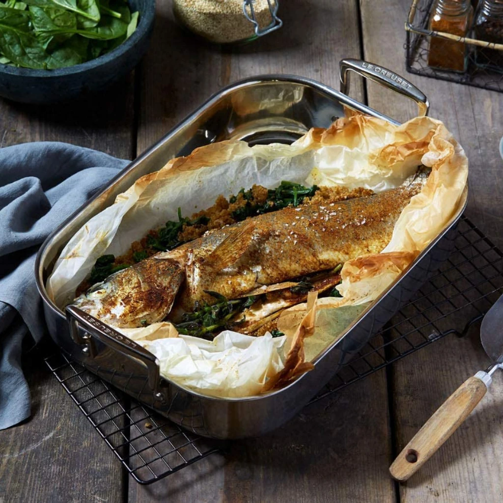 ¡Con esta Bandeja asadora de acero inoxidable Le Creuset conseguirás cocinar fantásticos asados! Versátil y práctica, es una bandeja ideal para su uso diario. Gracias a su tecnología multicapa 3-ply acumula y distribuye el calor de forma rápida, para que obtengas unos resultados maravillosos en menos tiempo y ahorrando energía.