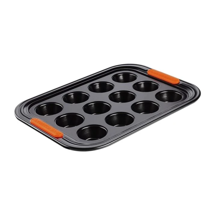 Molde antiadherente para 12 mini cupcakes de Le Creuset, fabricado en acero al carbono de gran espesor.