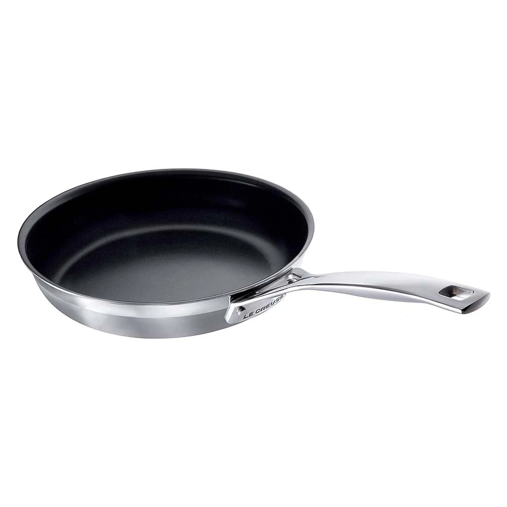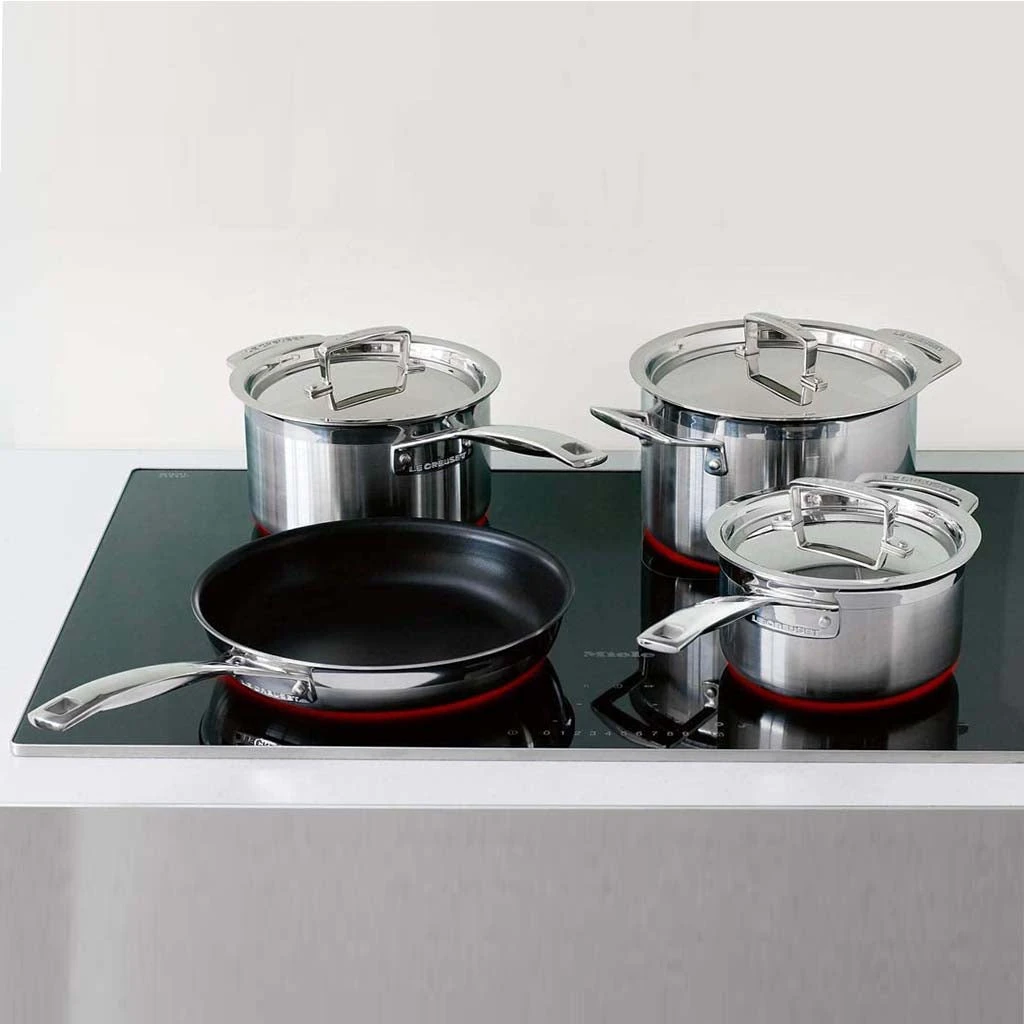 La Batería de 3 piezas de acero inoxidable Le Creuset es un elegante set de 3 piezas prácticas e imprescindibles en la cocina, fabricadas en el mejor acero inoxidable de la marca y con la tecnología multicapa 3-ply. La sartén cuenta con revestimiento antiadherente para cocinar tus recetas más sanas sin que se te pegue nada, aunque cocines casi sin aceite.