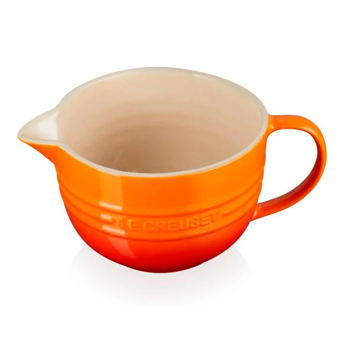 Bol con asa y pico vertedor, de 2 litros de capacidad y color naranja, de cerámica de gres, de Le Creuset.