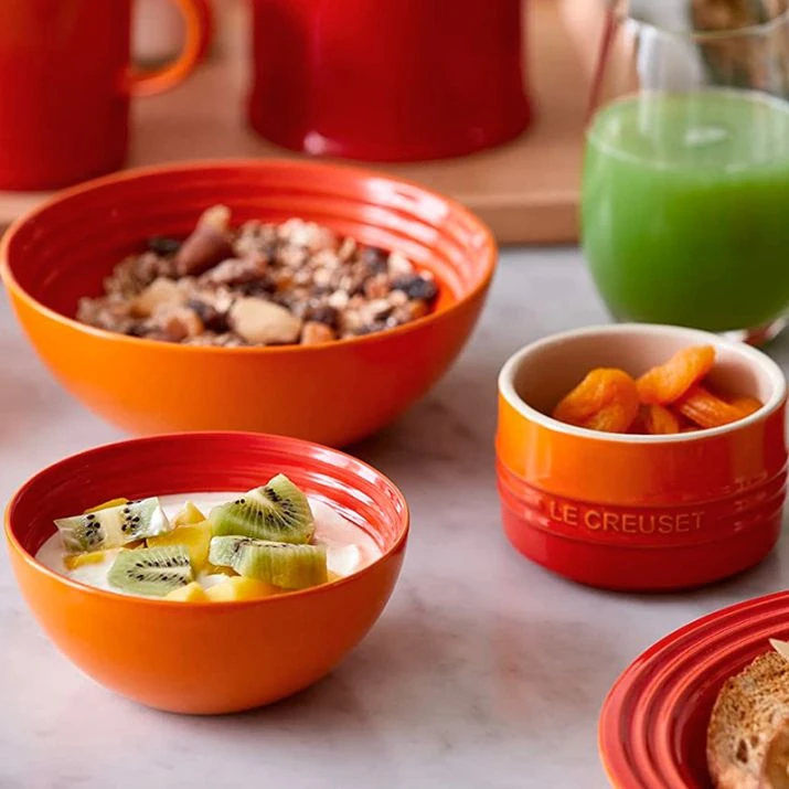 Bol de 650 mililitros de capacidad, de color naranja, de cerámica de gres, de Le Creuset.