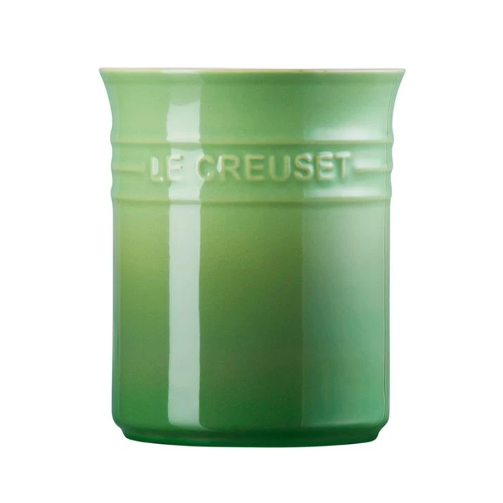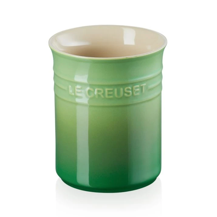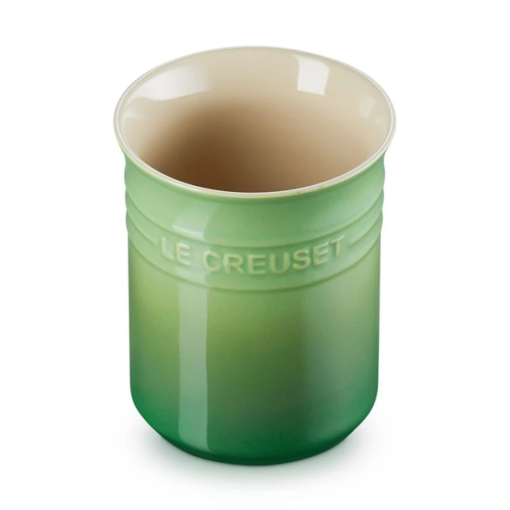 Bote para espátulas de Le Creuset, de color verde bambú, fabricado en cerámica de gres, para almacenar hasta 20 utensilios de cocina.