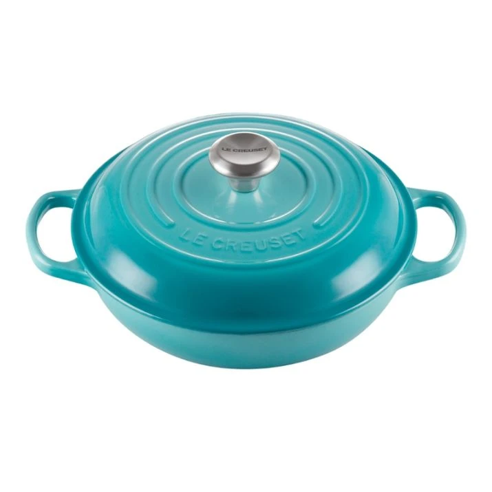 La cocotte baja Evolution azul de Le Creuset es una cazuela de hierro fundido esmaltado con un sistema de vitrificado único.