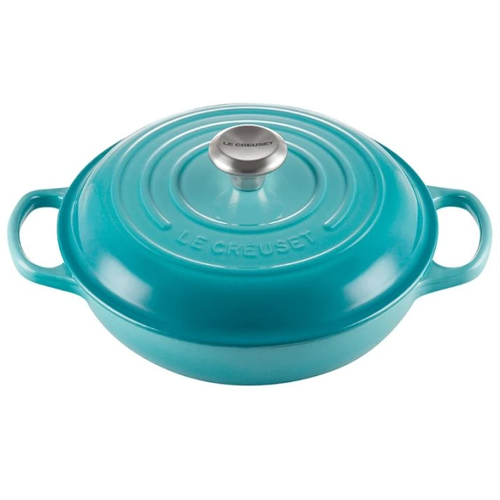 La cocotte baja Evolution de color azul de Le Creuset es una cazuela de hierro fundido esmaltado con un sistema de vitrificado único.