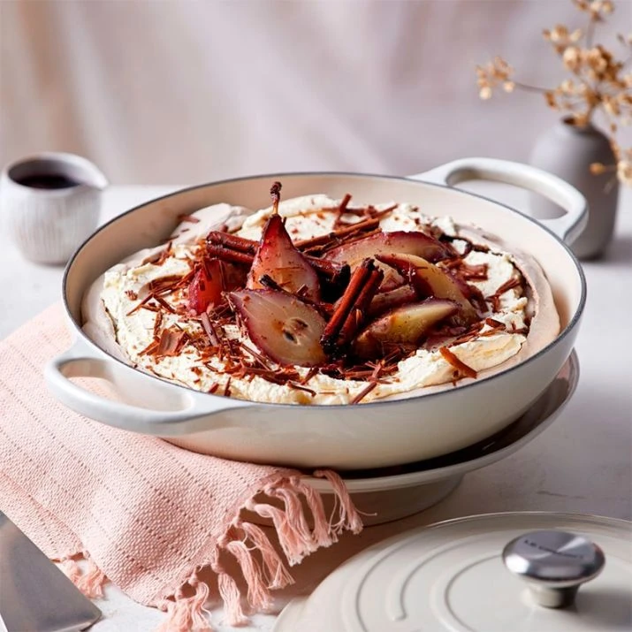 La cocotte baja Evolution de color merengue de Le Creuset es una cazuela de hierro fundido esmaltado con un sistema de vitrificado único.