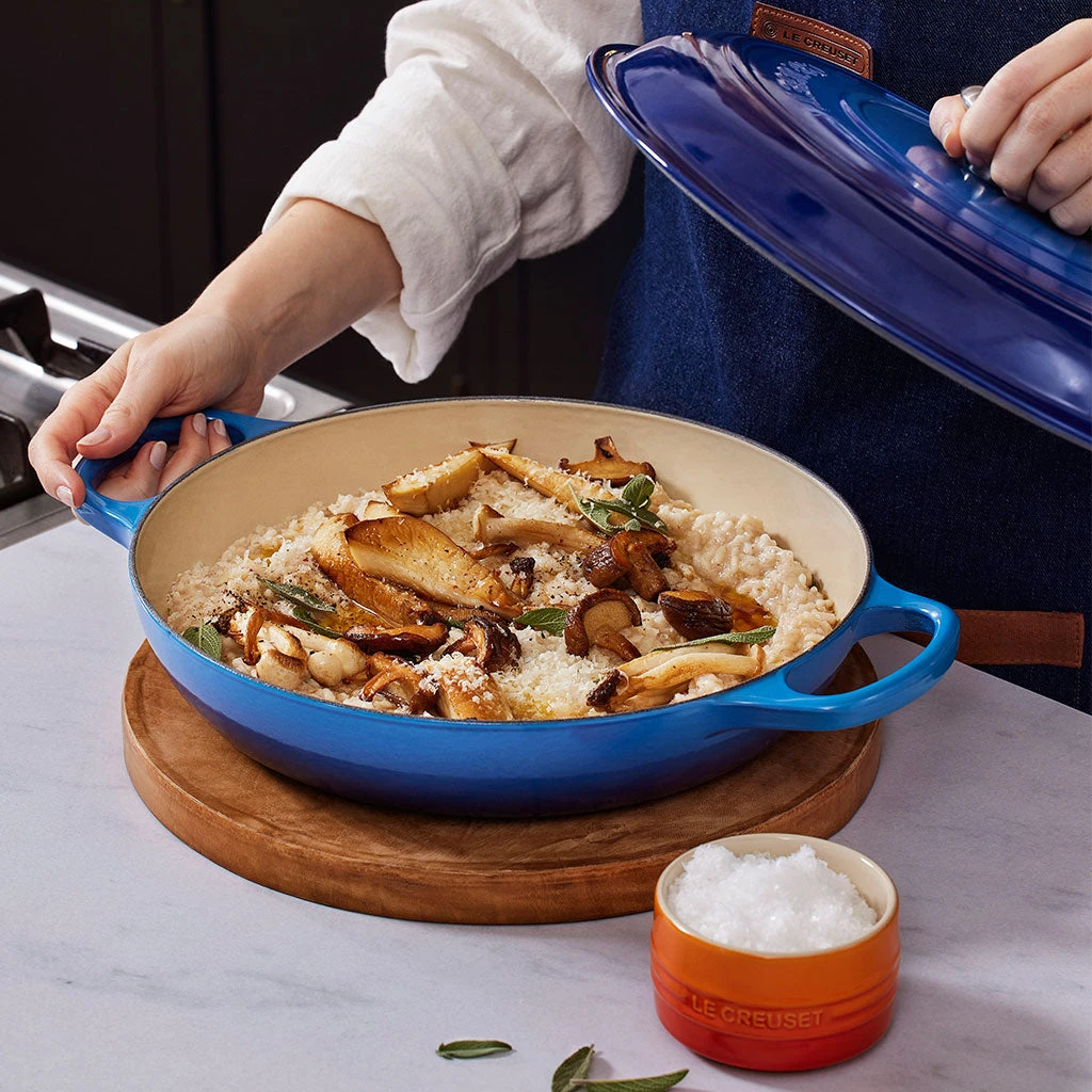 La Cocotte baja tipo cacerola Evolution Le Creuset es una olla de hierro con un diseño especial de Le Creuset, ideal para guisos que requieran una superficie amplia de cocción, como los arroces, que en esta cazuela te quedarán de estrella Michelin.