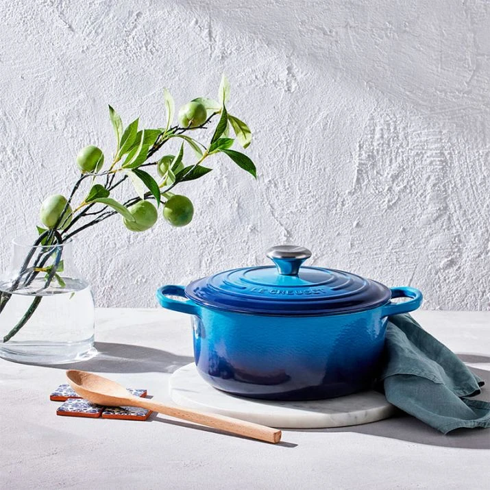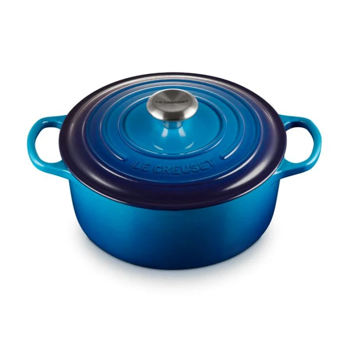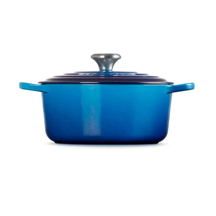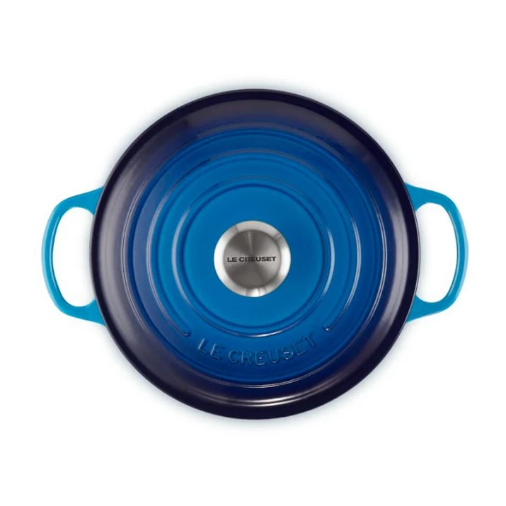 La cocotte redonda Evolution azul de Le Creuset es una cazuela de hierro fundido esmaltado con un sistema de vitrificado único.