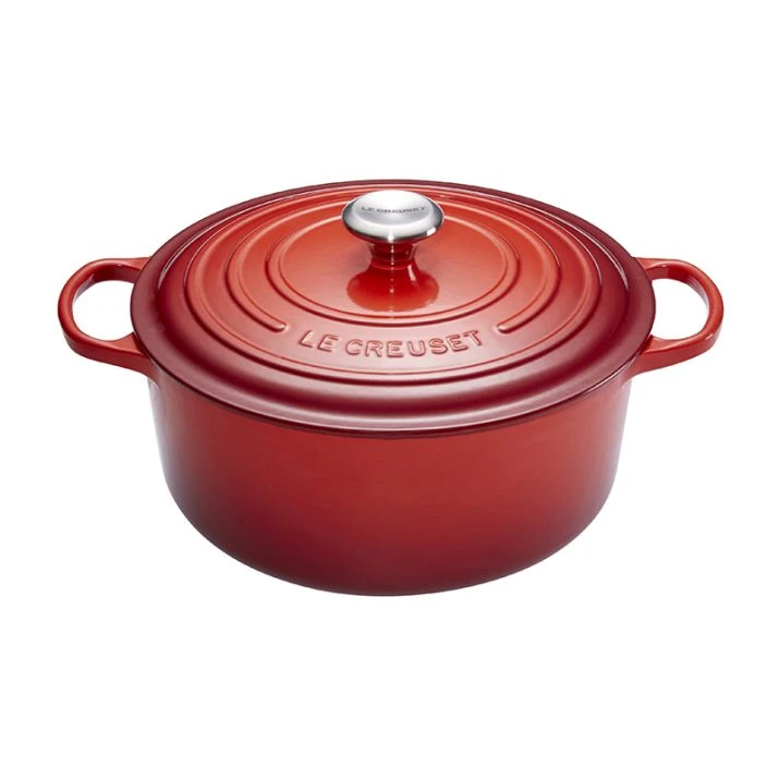 La cocotte redonda Evolution roja de Le Creuset es una cazuela de hierro fundido esmaltado con un sistema de vitrificado único.
