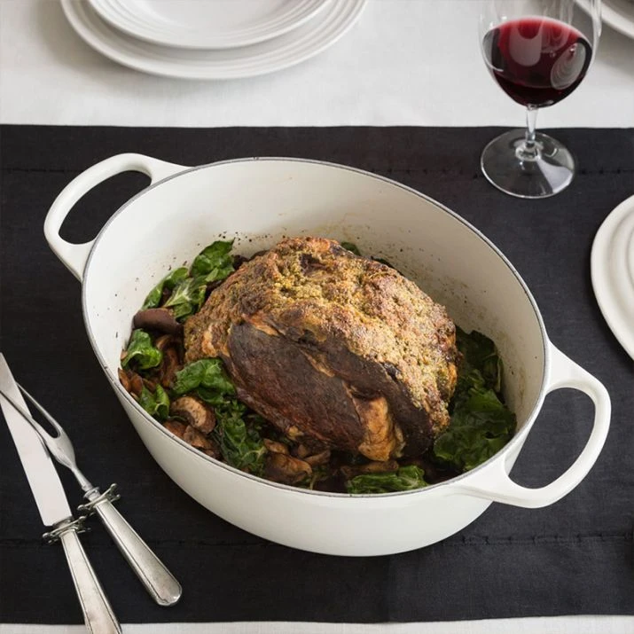 Además, su diseño, color satinado y asas grandes permiten que se sirvan los alimentos del fuego directamente en la mesa con una elegante presentación.