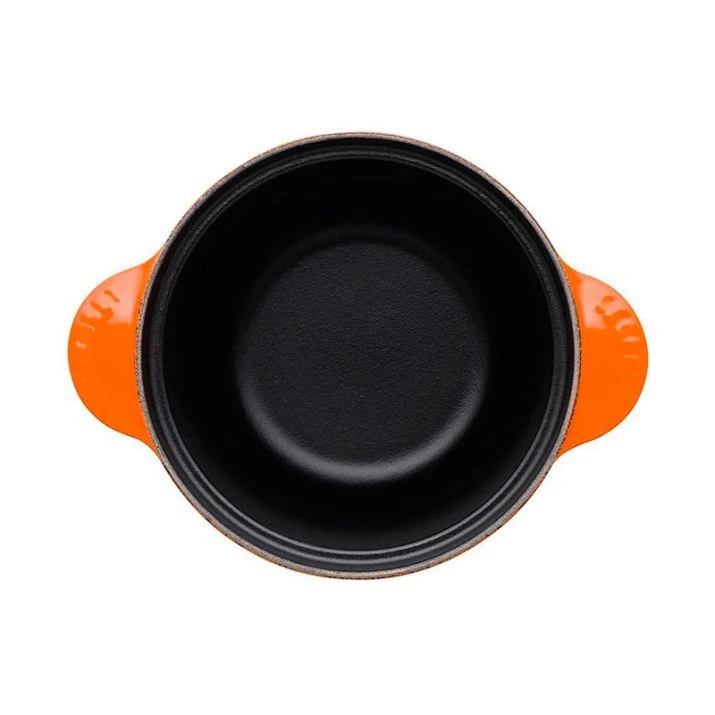 Es una cazuela de hierro fundido esmaltado con un sistema de vitrificado único, con el fondo cóncavo y la tapa abovedada.
