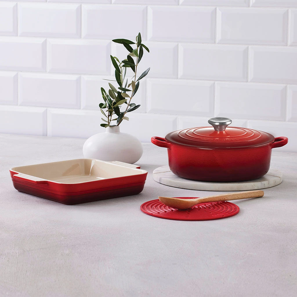 El Conjunto 3 piezas Le Creuset es un completo set de tres utensilios con el que vas a disfrutar cocinando y sirviendo tus mejores recetas. Un pack que incluye una cocotte baja tipo rustidera de hierro fundido, una bandeja cuadrada cerámica y un salvamanteles de silicona. Tres piezas tan prácticas como bonitas, con la calidad de Le Creuset.