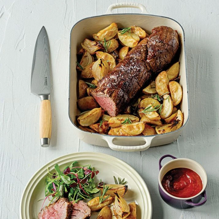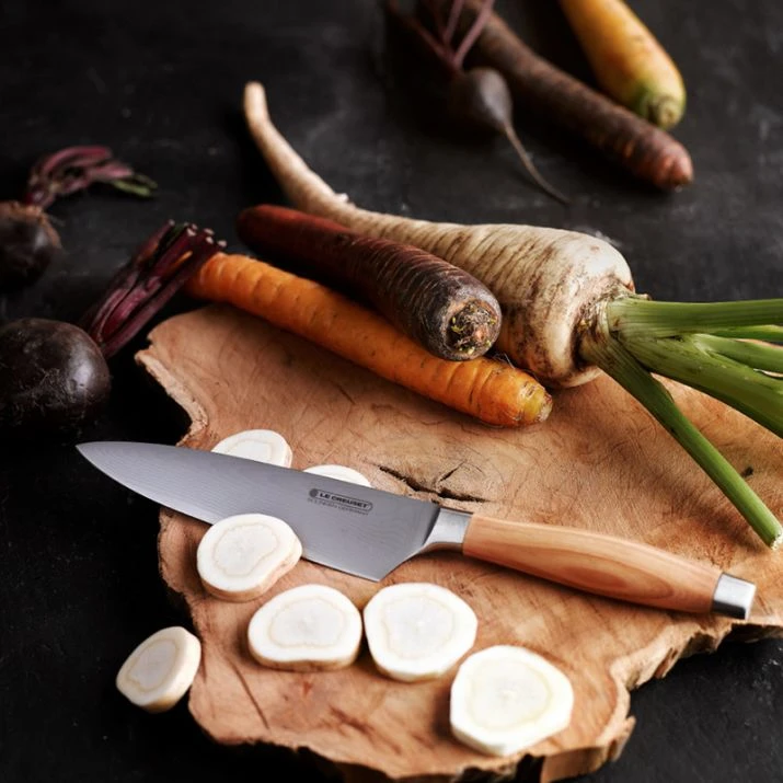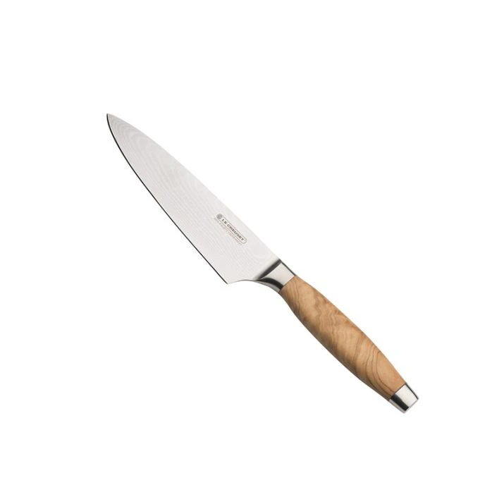 Cuchillo del Chef de Le Creuset, con mango de madera de olivo y hoja fabricada en 64 capas de acero damasco con un centro de VG-10.