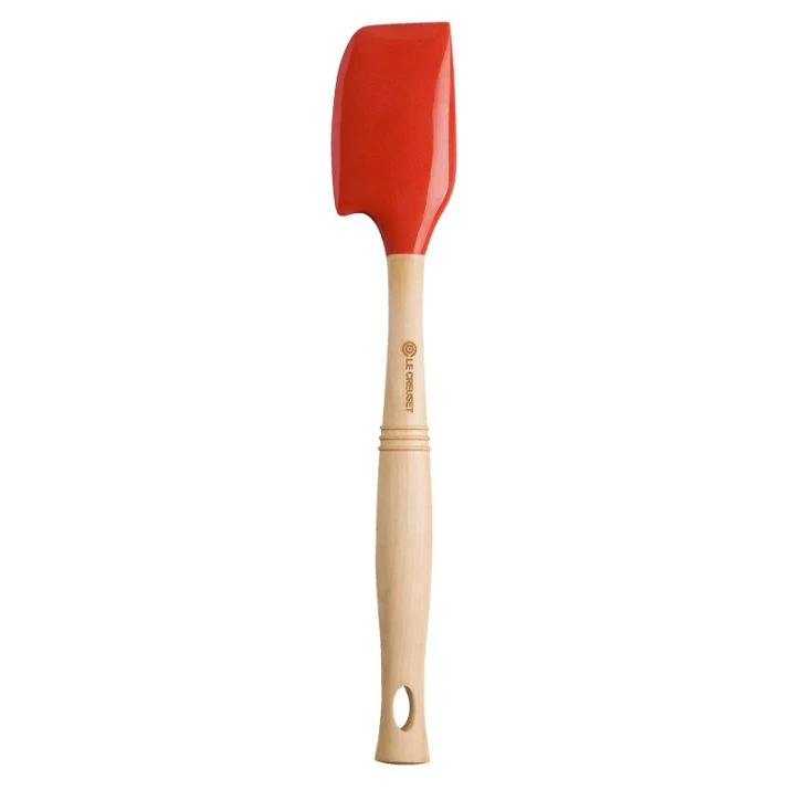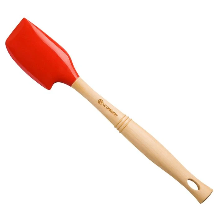 Espátula Pro media de Le Creuset, con cabezal de silicona rojo y mango ergonómico de madera.