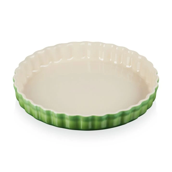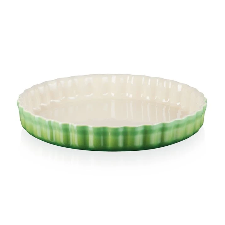 Molde redondo de color verde bambú de Le Creuset, fabricado en cerámica de gres con borde ondulado, para cocinar en el horno o en el microondas.