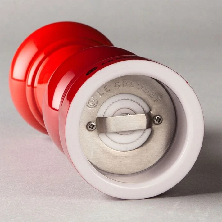 Molinillo rojo de Le Creuset, con cuerpo de plástico, mecanismo de cerámica y pomo regulador de acero inoxidable.