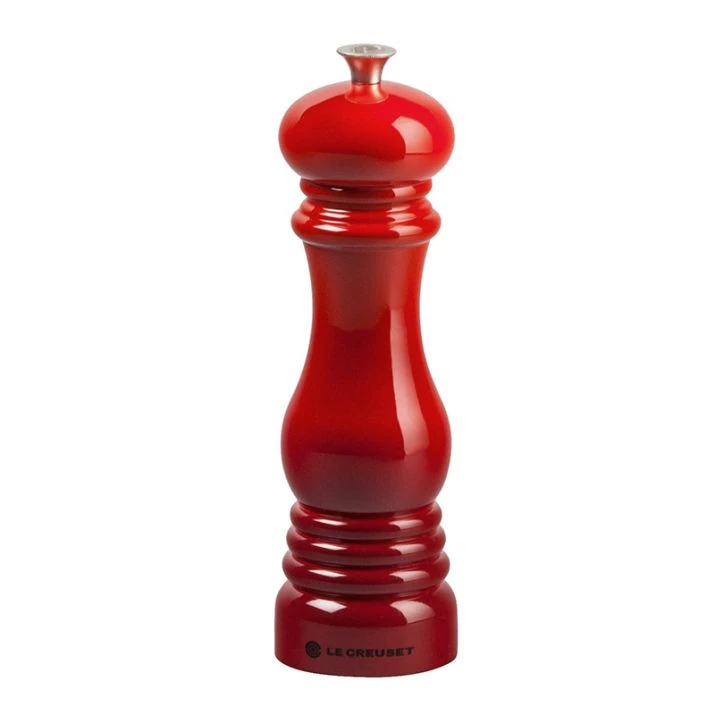 Molinillo rojo de Le Creuset, con cuerpo de plástico, mecanismo de cerámica y pomo regulador de acero inoxidable.
