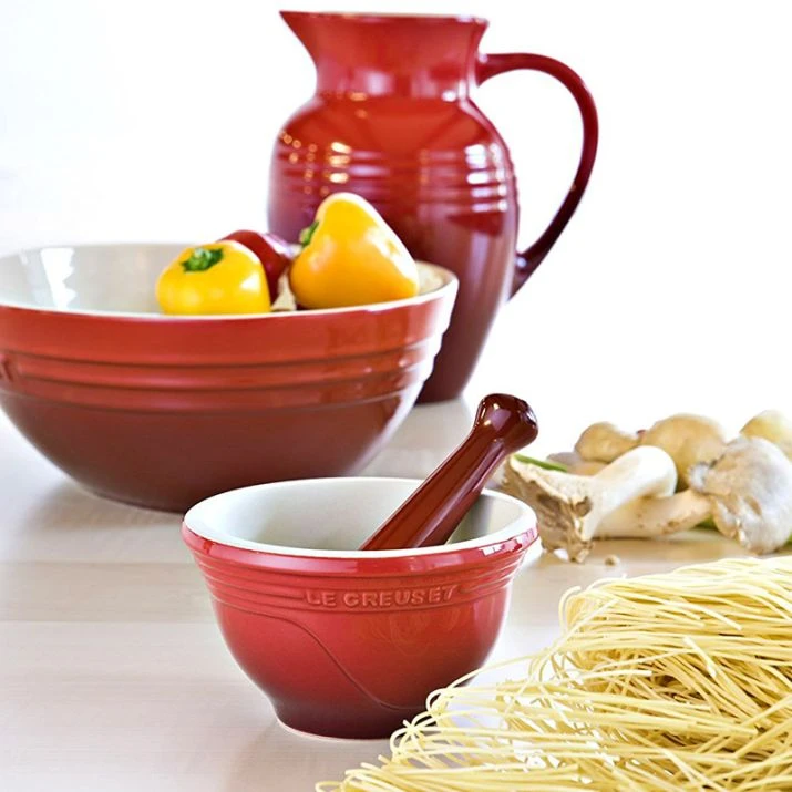 Mortero de Le Creuset fabricado en cerámica de gres, perfecto para machacar ingredientes.