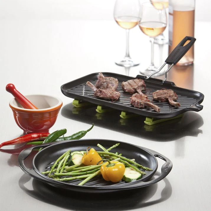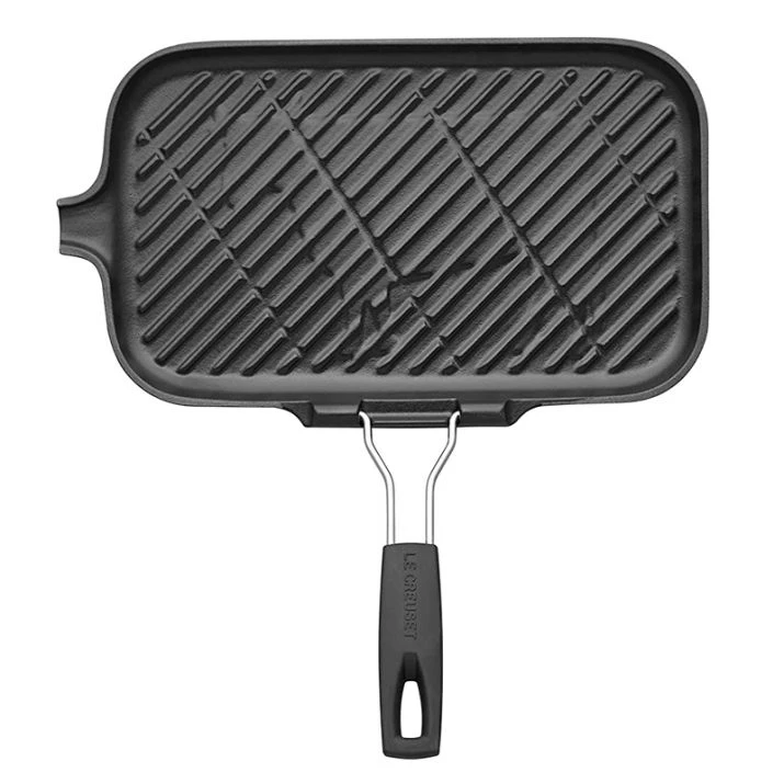 La parrilla grill rectangular con mango abatible de Le Creuset es una parrilla de hierro fundido esmaltado con un sistema de vitrificado único.