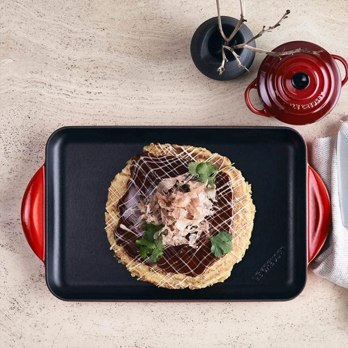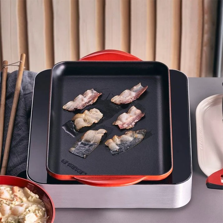 La parrilla lisa rectangular de Le Creuset es una parrilla de hierro fundido esmaltado con un sistema de vitrificado único.