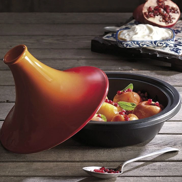 Tajine de Le Creuset, de 31 centímetros de diámetro, fabricado en hierro fundido esmaltado, para cocciones suaves, sabrosas y nutritivas.